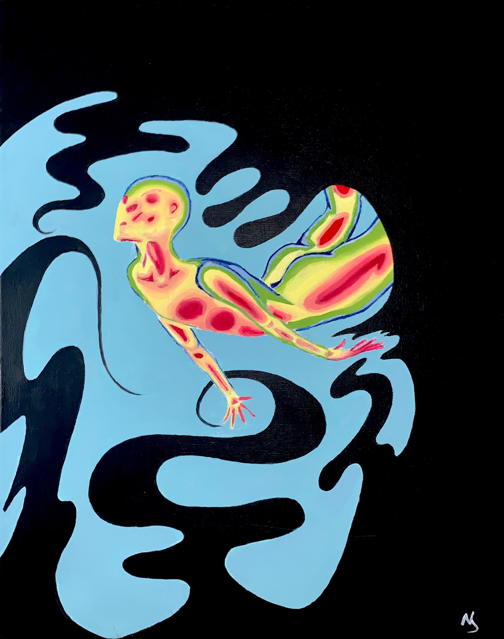 A being appears suspended between movement and stillness, clarity and confusion. A quiet, colorful resilience pulses through the figure as it navigates emotional stagnation, searching for direction in a wave of black goo.